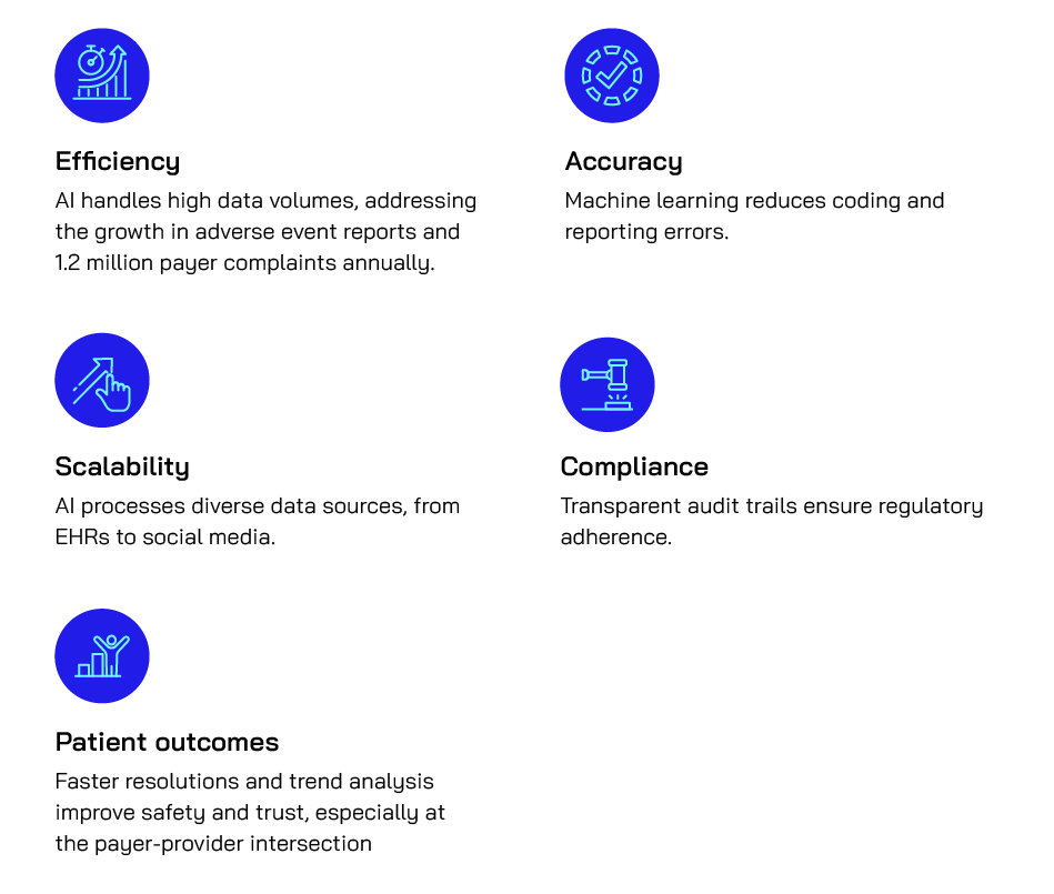 - End-to-end automation: Managing complaint lifecycles, from intake to resolution, across payers, providers, and PV.