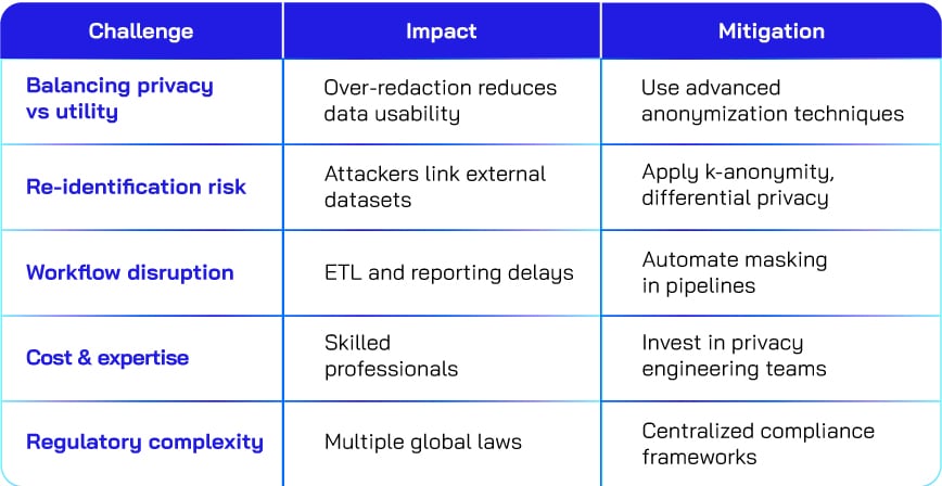 Implementing data redaction and de-identification is not without hurdles. Organizations often struggle with balancing privacy and data utility, mitigating re-identification risks, and managing workflow disruptions. The table below outlines common challenges, their impact, and practical strategies to address them.