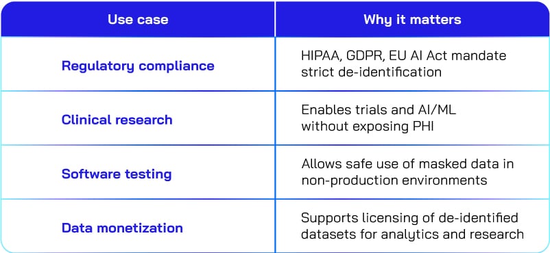 From ensuring regulatory compliance to enabling AI-driven research, data redaction and data de-identification techniques help organizations use data responsibly without compromising patient privacy. The table below highlights key use cases and why they matter.